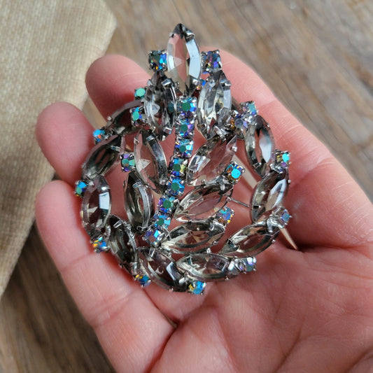 Vintage aurora borealis AB and smoke rhinestone leaf brooch dimensional
