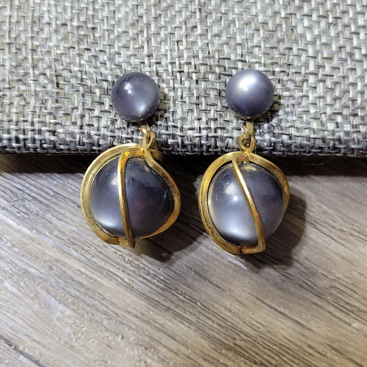 Moonglow Lucite dark gray caged screw back earrings vintage MCM minimalist