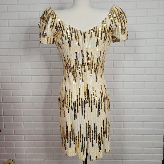 Alyce Designs size 10 cream gold sequin short cocktail party dress mini vintage 1980s